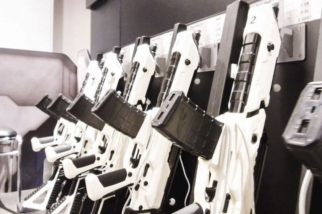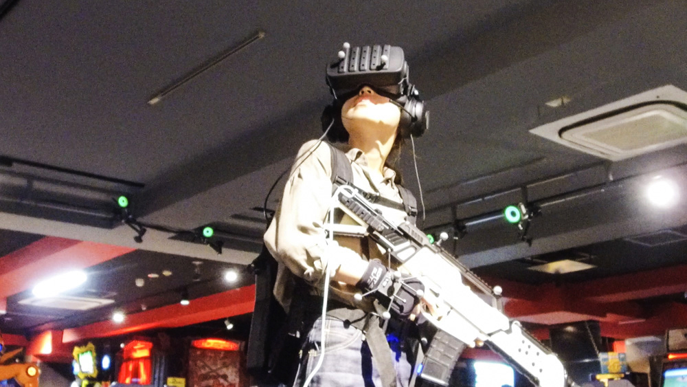 モータルブリッツは、写真のようにVR用のゴーグルをつけて銃を構え、VR空間を歩き回って襲い来る敵を倒すガンシューティングアトラクション。