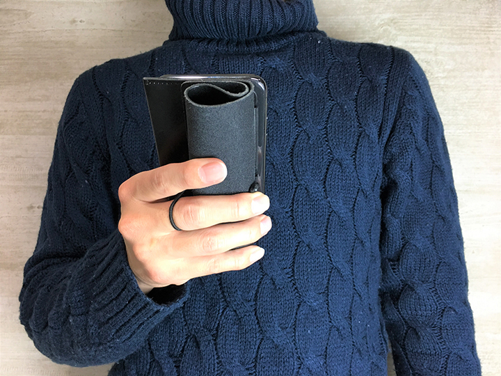 一枚の革を折り返して、iPhoneを貼り付けたアタッチメントを挿入するだけという、極めてシンプルな構造。