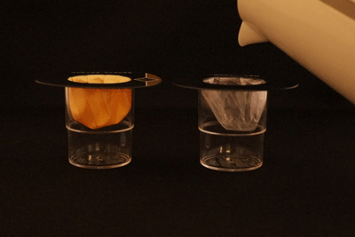 ゴアテックス 素材と一般的なビニール素材を用意し、コップの中にセットします。
