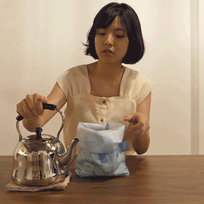 食べ終わったら、液体を捨てて、もとの様に小さく折り畳みます。これで持ち帰りも楽々。汚れも気になりません。