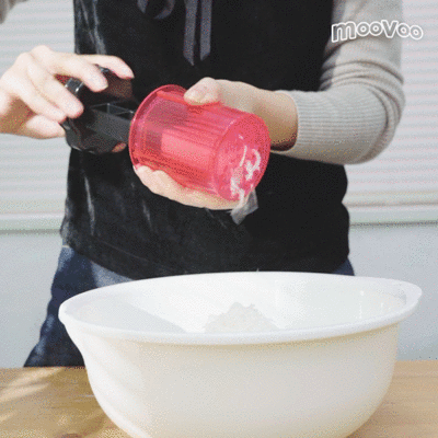 『モチケズ』は、お餅を削れる専用器。こちらも市販の切り餅をセットして使用します。使い方は、とってもシンプル、ひたすらくるくる回すだけ。ちなみに、切り餅1つを約100回転で削ることができるそう。大量に削るとなるとなかなか大変な作業なので、ボーっとテレビを見ながら削ったり、友達、家族でワイワイしながら作業するのがいいかもしれません。