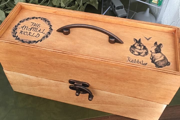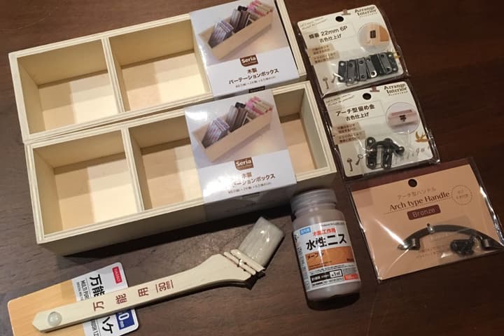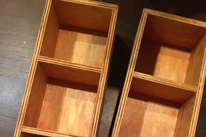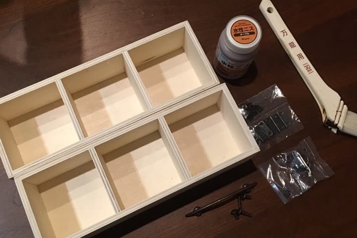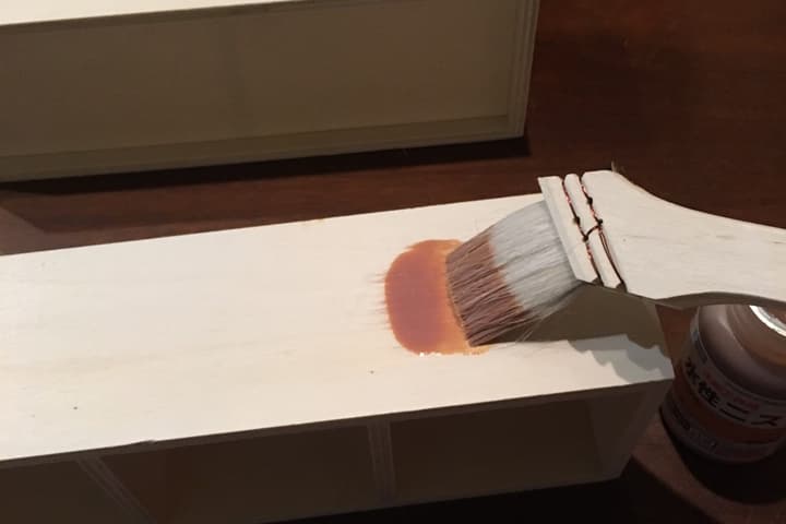水性ニスで木製パーテーションボックスを塗っていきます。2個あるので、1個の側面を塗った後、2個目の側面を塗るなど交互に塗っていくと乾かしながら塗ることができます。
