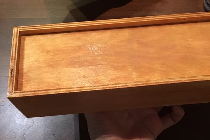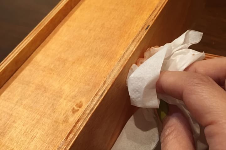 ④水性ニスをティッシュでふき取る。