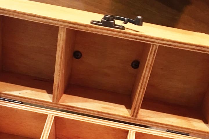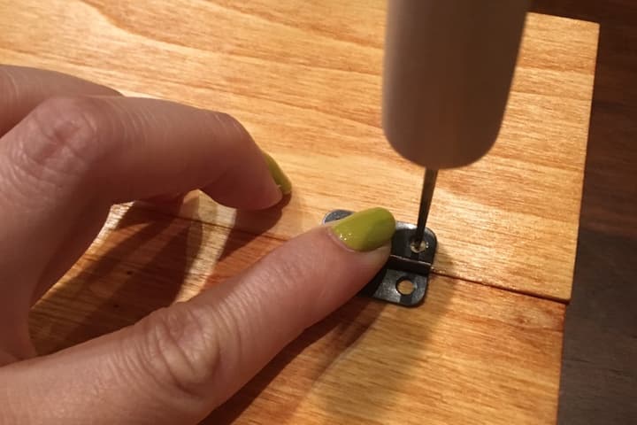 蝶番を取り付ける際は、木製パーテーションボックスがずれないように抑えながら留めていきましょう。