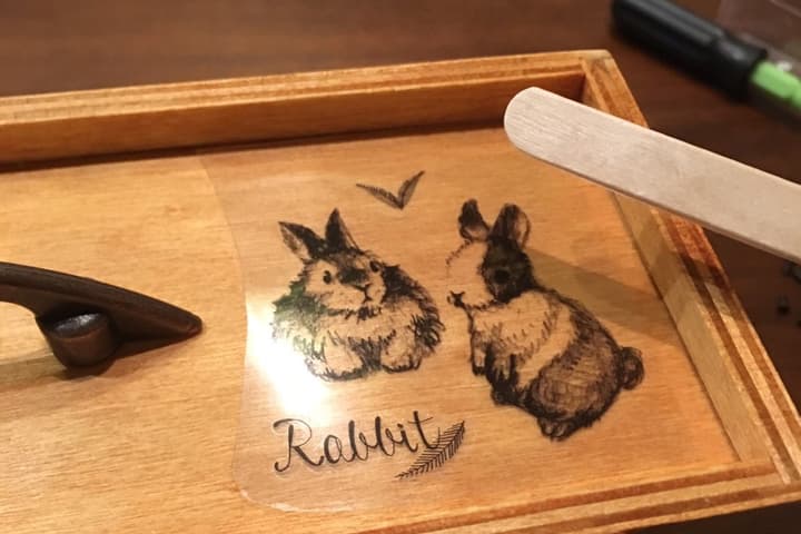 転写シールをカットして、デザインを貼り付ける場所を決めます。場所が決まったら、裏の透明シートをはがし、木製のスティックで表面からこすります。