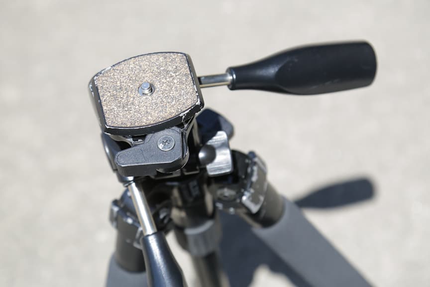 3ウェイ雲台:一眼レフを取り付けると縦方向と水平方向に角度を細かく調整することができます。風景など、動かないものの撮影に適しています。