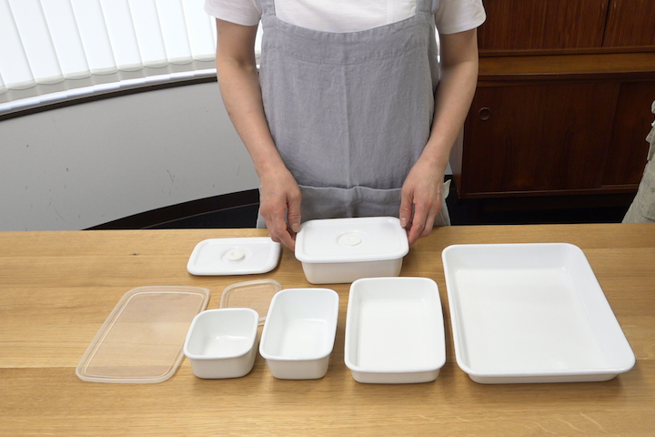 様々な形とシール蓋・密閉蓋の2種類の蓋があるのが特徴的な野田琺瑯のホワイトシリーズ。