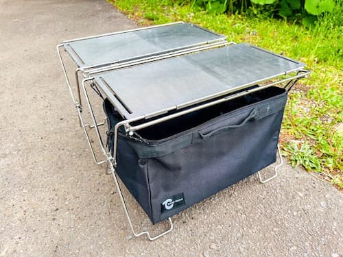 折りたたみ式の脚を組み、炉を上にセットするだけの簡単設営です。使わないときには、折りたたんでコンパクトに収納できます。焚き火台と調理台の両方を兼ね備えているので、ソロキャンプで使うと荷物のコンパクト化に役立つ商品です。