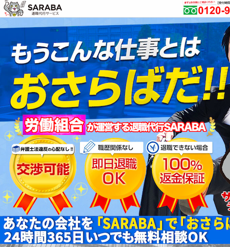 労働組合が運営している退職代行サービスSARABA。労働組合が運営しているからこそ、「退職日の調整」「未払い料金や残業代などの金銭請求」など一般の退職代行ではできないサービスが魅力です。