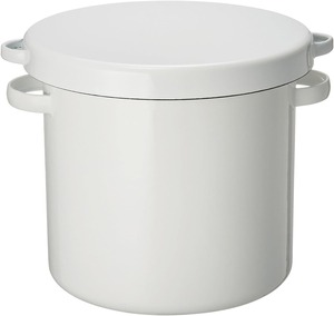 フタ・本体ともにホーロー製の、光沢と質感がおしゃれな米びつ。ラウンドフォルムの取っ手付きで、米びつには見えないデザインです。