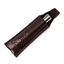 伸縮式のため収納時は長さ約9.2cmになり、ロゴマークが型押しされた、おしゃれなベルトループ付き本革ケースに入れて手軽に持ち運べます