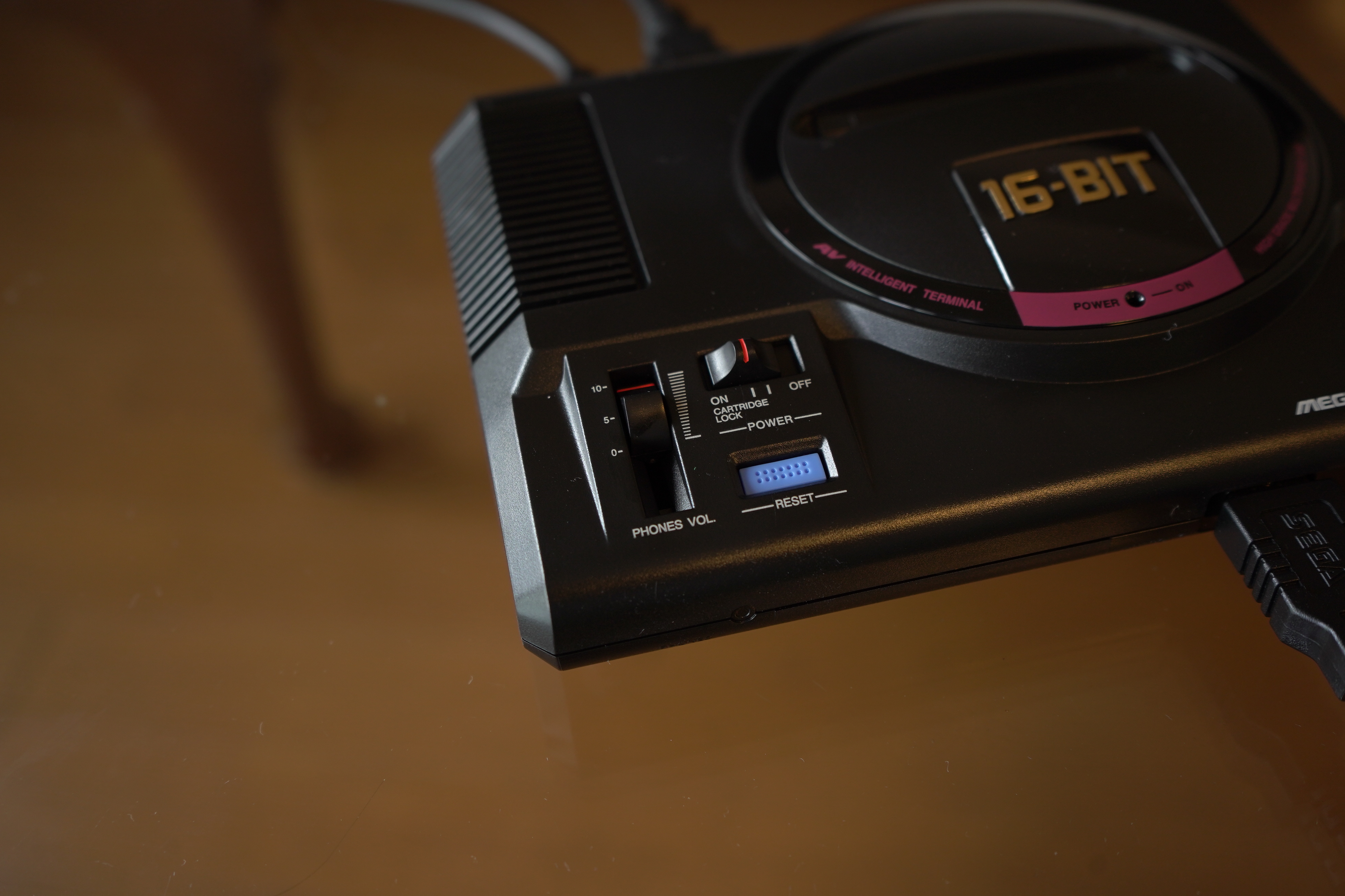 上の図は『メガドライブミニ』の本体の左下にあるスイッチ各種をアップした画像もので、パワースイッチは以前のモデルと同様に使用することができます。カートリッジスロットの開閉する蓋やヘッドフォンボリューム、拡張スロットなどは元の機能はないものの、可動ギミックとして以前のモデルを忠実に再現しました!