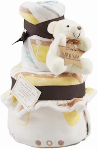 ハンドタオル3枚、スタイ6枚、くまさんのぬいぐるみ、おむつ4種類8枚がセットになったおむつケーキ。