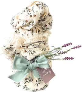 おくるみやバスタオルなどの布製品を用意しているときは、土台のおむつに折り込みながら巻きつけて、上からリボンを巻いて飾るとよいでしょう。