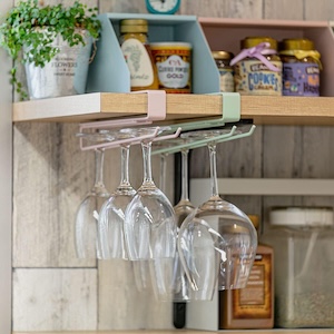 ワイングラスホルダーとは、ワイングラスを逆さまに吊るして収納するキッチン用品のことです。ワイングラスにホコリが入りにくく、水切れもよくなります。
