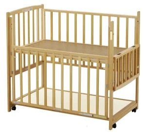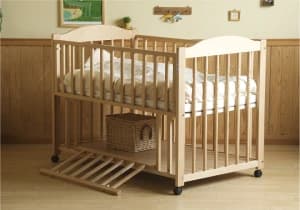 「使いやすさ」にこだわって作られたベビーベッド。かがまずにお世話ができるハイタイプで、腰の負担を軽減します。