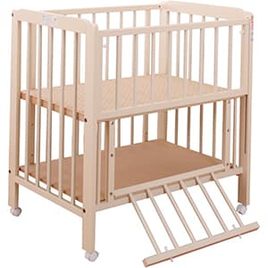 床板の高さを約70cmに調節できるハイタイプで、腰への負担が少なく済みます。また、ベッドの前面と側面の2か所をスライド開閉できるのが特徴。足元側からも開けることができると、おむつ替えがしやすく、抱っこで寝かせた赤ちゃんをベッドにおろす際にも便利です。