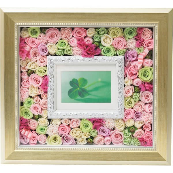 • プリザーブドフラワーをふんだんに使用したフラワー額です。フォトフレームの周囲を色とりどりの花が彩ってくれます。