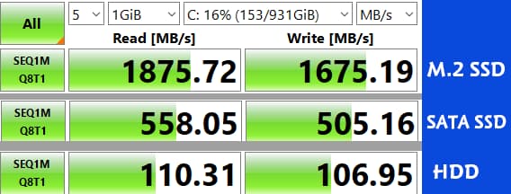 実際に筆者の自宅にある「M.2 SSD」「SATA SSD」「HDD」の読み書き速度を、定番ソフトCrystal Disk Markで比較してみました。モデルや環境ごとに速度は違いますので、一例としてご紹介します。