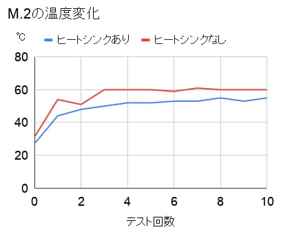 ヒートシンクがないと、テスト3回目には60度まで上昇。その後も同水準の温度が続きました。