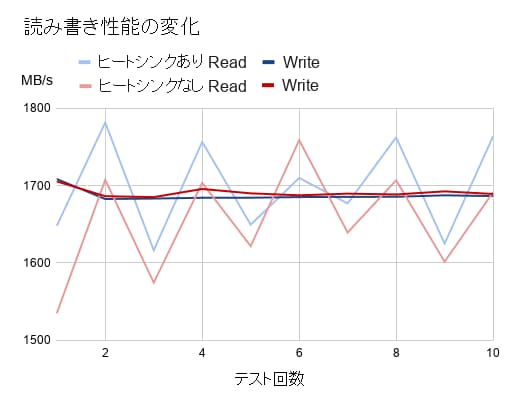 理由を詳しく分析できていませんが、書き込み性能は差が出ない一方、読み取り性能は「ヒートシンクあり」のほうが全体的に高く出ています。