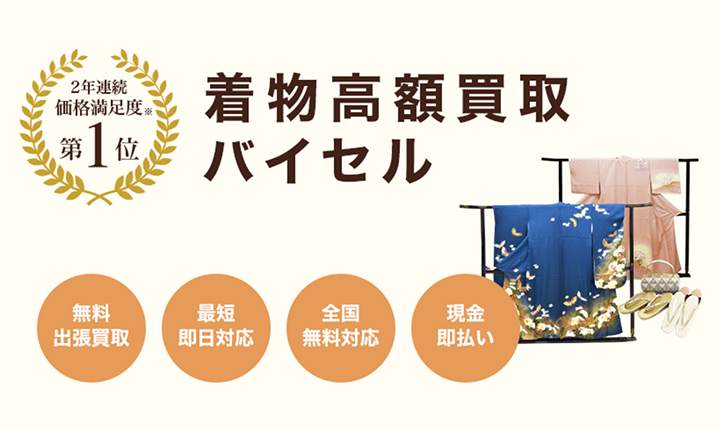 バイセルは着物の買取価格が高価であり公式サイトによると、顧客満足度・価格満足度が高い出張買取として「No.1」を獲得しています。過去には「他店よりも買取価格が1円でも安ければ全品返却するキャンペーン」を行っていました。