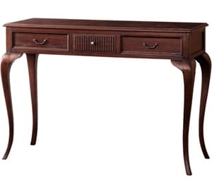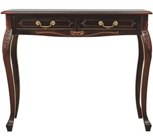 天板下から湾曲している猫脚は手彫り仕上げで、クラシカルな雰囲気をただよわせています。両サイドと中央で違うデザインの、3つの引き出しもおしゃれです。
