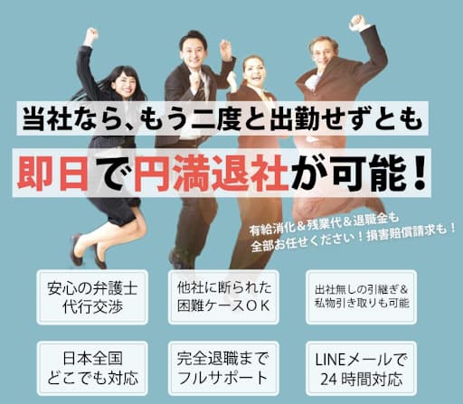 また、いま現在未払い給与がある方や、有給を消化したい方、損害賠償の請求を行いたい方は、金銭を要求することが法的に認められている、弁護士法人の退職サービスでないと対応してくれないので、注意してください。