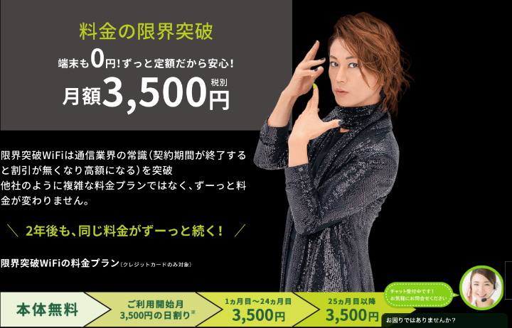 限界突破WiFiは、端末代金0円で月々3500円から使える、ポケットWiFiです。