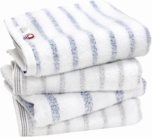 国内生産にこだわるヒオリエの今治タオルラインナップのひとつ、「今治タオル ボーダー フェイスタオル ミスト 4枚セット」です。