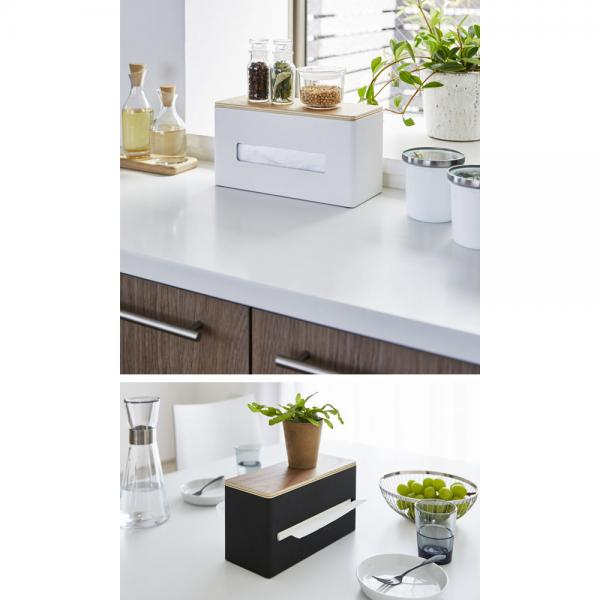 中には可動式の仕切りがついていて、表と裏のどちら側からもペーパーの引き出しができるため、対面する座席からでもペーパーを引き出すことが可能。また、2種類のペーパーをセットして対面式カウンターに設置し、キッチン側ではキッチンペーパーを。食卓側ではティッシュをセットする。という使い方も可能です。