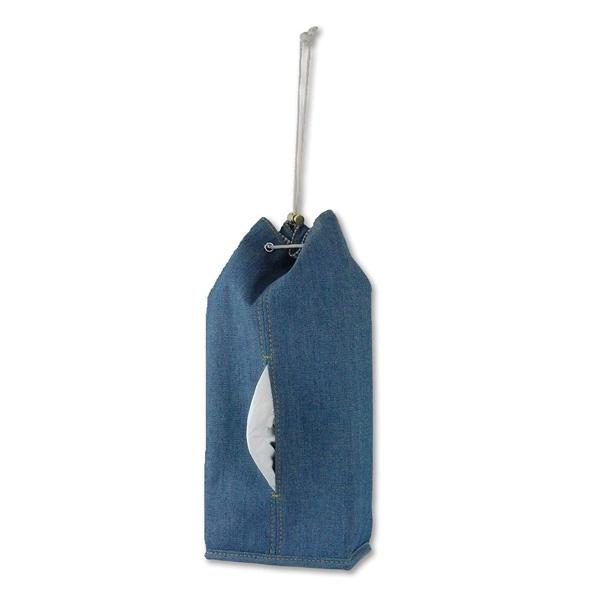 狭い車内でも置きやすい、吊り下げ可能な巾着型。出し入れ口にティッシュを箱のままセットするだけで使えます。