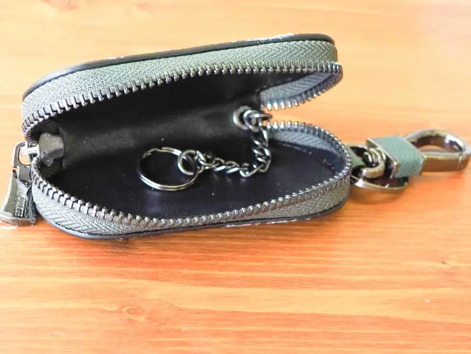 カジュアルからスタイリッシュまで幅広い展開をみせるメンズファッションブランド「VANQUISH」による、光沢感のあるシボが特徴の「楕円形キーケース」です。