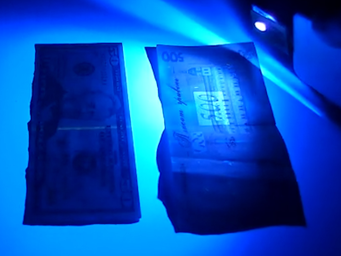「UV」の紫外線ライトを紙幣に当てれば、その紙幣が本物かチェックできる。通常、紙幣には紫外線発光インクが使われている。そのため紙幣に光を当てると、青白く光って一部が浮かび上がるようにみえるのだ。紫外線発光インクが使われていない紙幣とは区別がつくようになる。