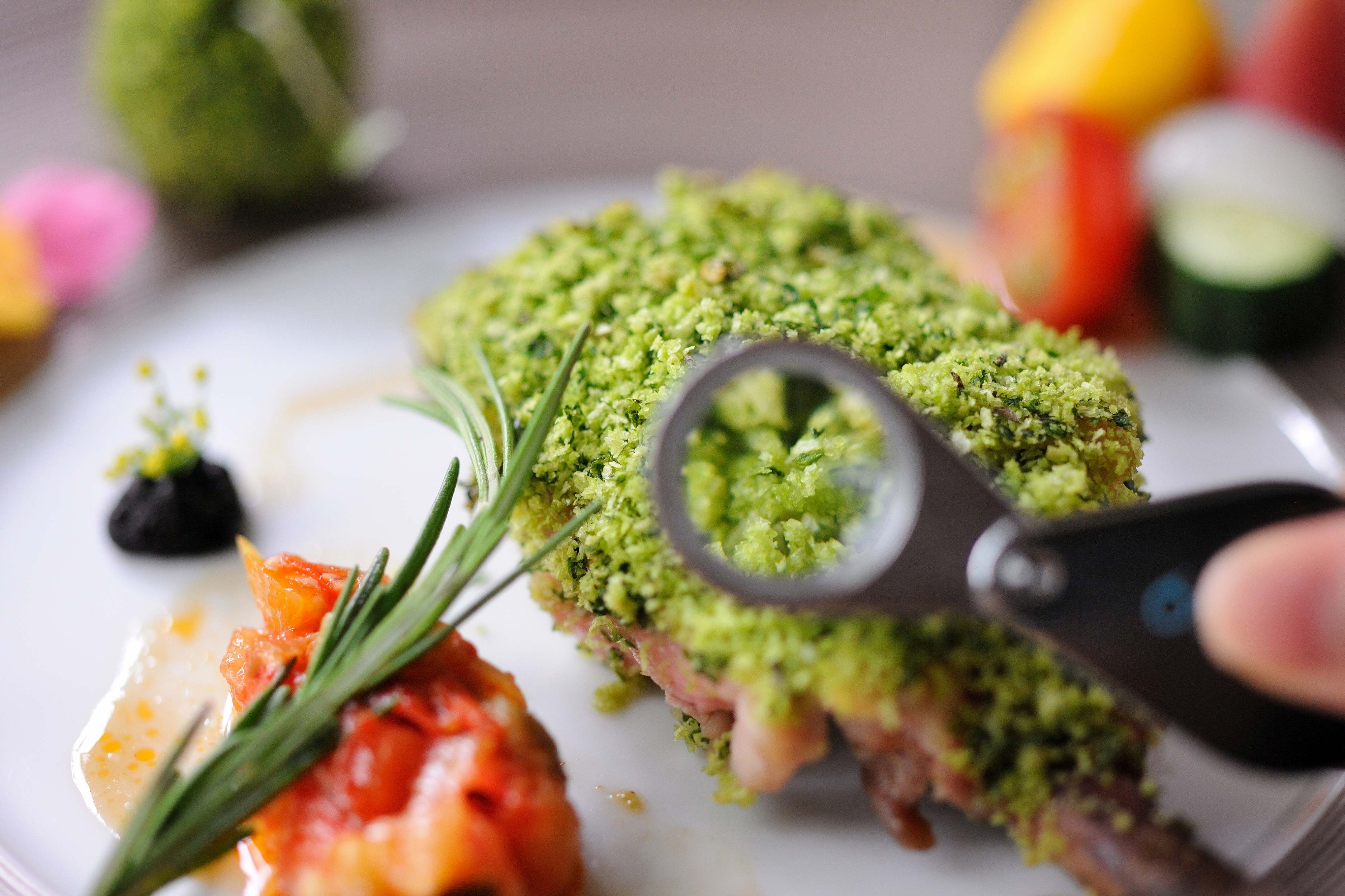 料理を食べる前にはルーペを使い実際に苔をかんさつしている気分を体験できます。
