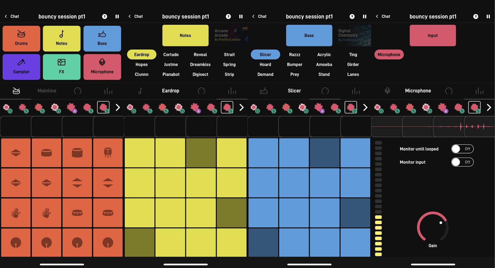 Drumsのページではドラムを打ち込むことができます。Notesはキーボード、Bassはベース音など、さまざまな音源が入っています。