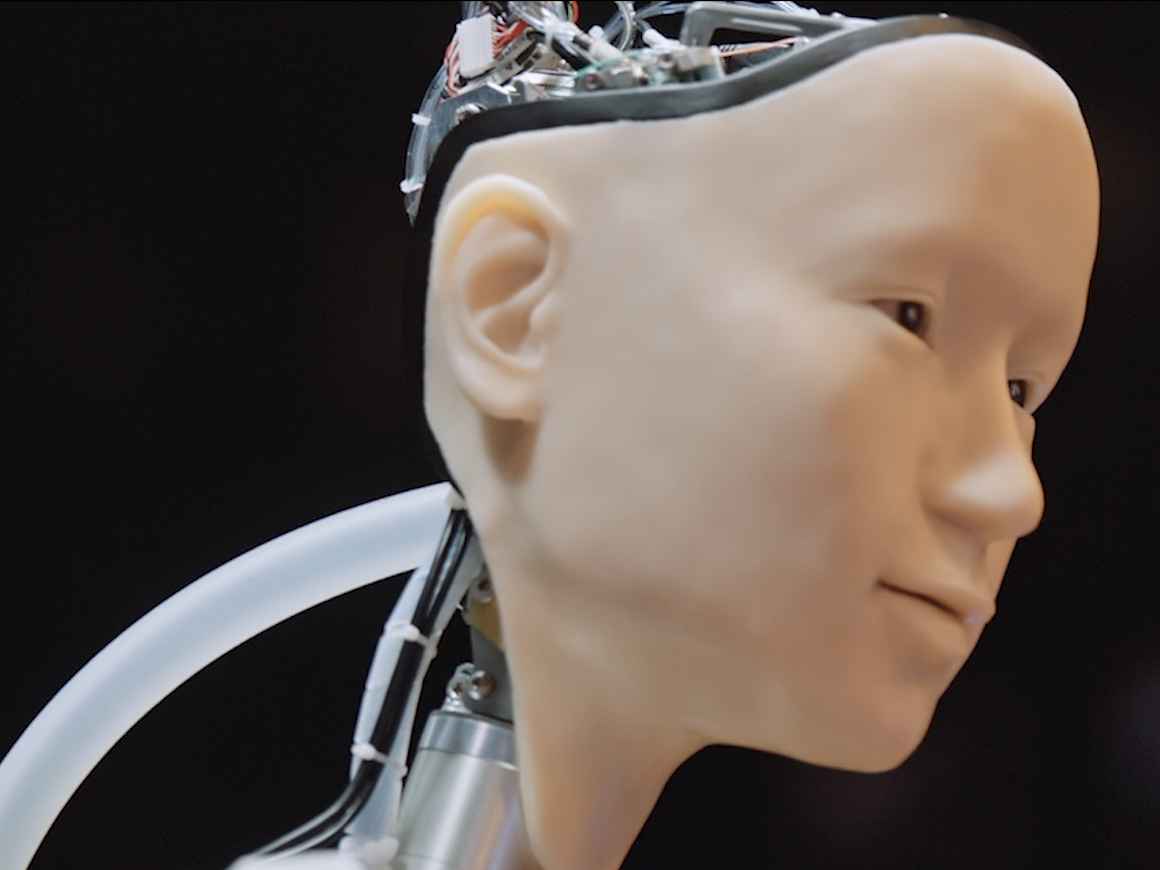 顔と体の一部のみが人間の皮膚を模しており、それ以外は無機質さを感じる機械の体。その完全に人間に寄らない姿がSF感あふれる演出につながっている。