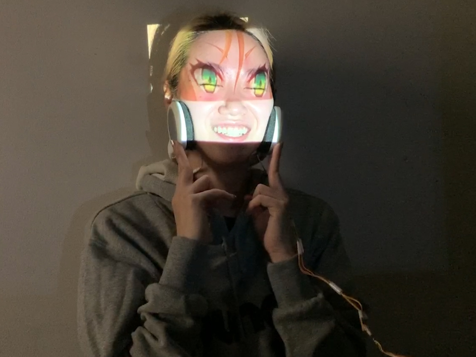 プロジェクターを使って、自分の顔に他人の顔を3D投影。口元につけた装置が、噛む筋肉を刺激して、他人の口の動きを再現する。