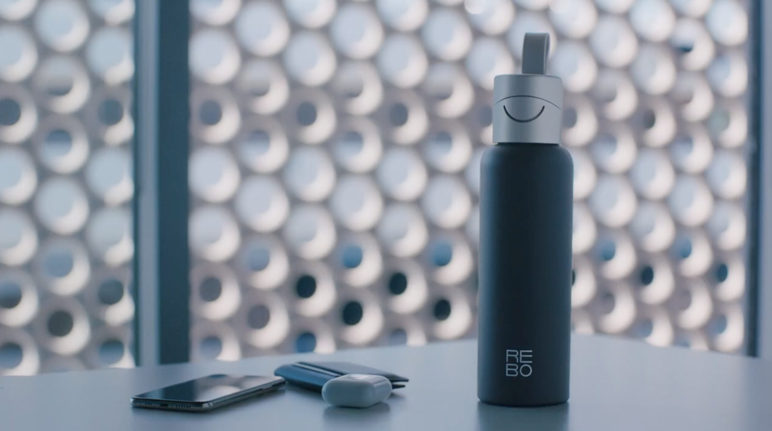 海の色を表現したカラーバリエーションやバッグにぶら下げられる持ち手。REBO自体は運動や仕事に持っていけるようなおしゃれなデザインだ。
