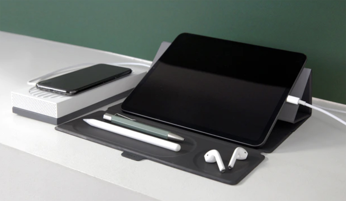 パワーバンクはワイヤレス充電にも対応しており、スマホやイヤホンにPCをそれぞれ充電しつつ快適に作業が可能だ。パワーバンクの表面は凹凸したデザインで、上にペンを乗っけても転がらないという嬉しい配慮まで施されている。