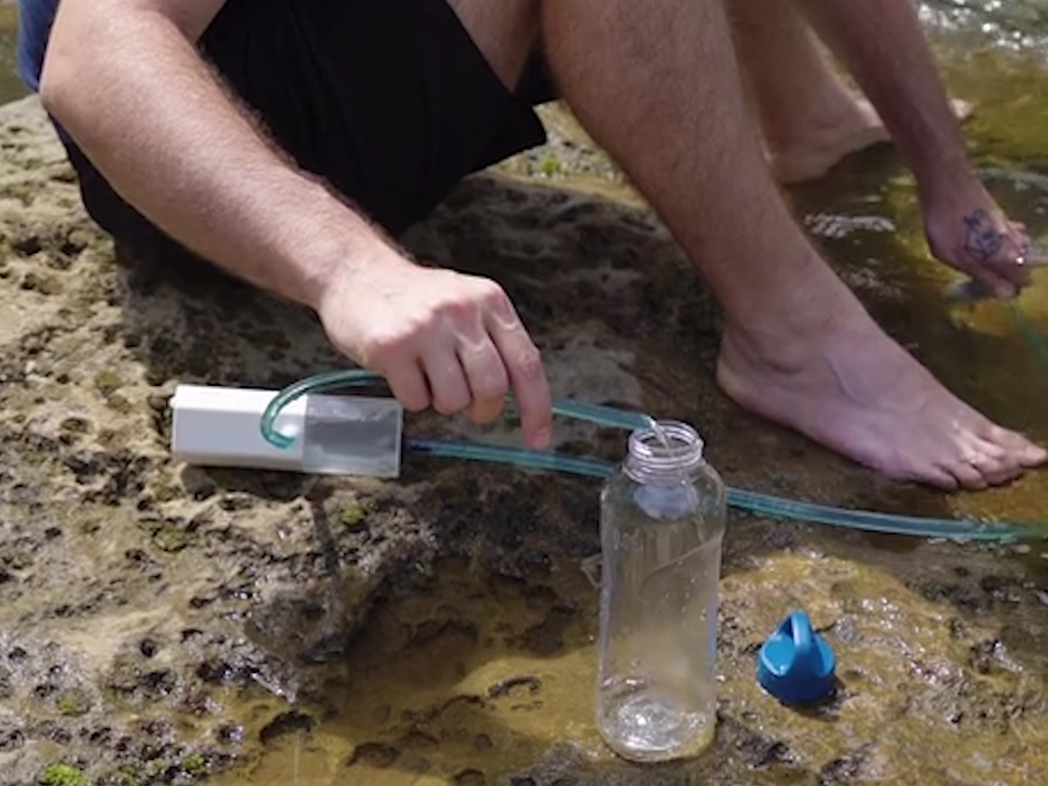 アウトドア用品の製作チーム Flextail Gearが開発中の、天然の水を飲料水へと自動で濾過する携帯浄水器「Light Water」。