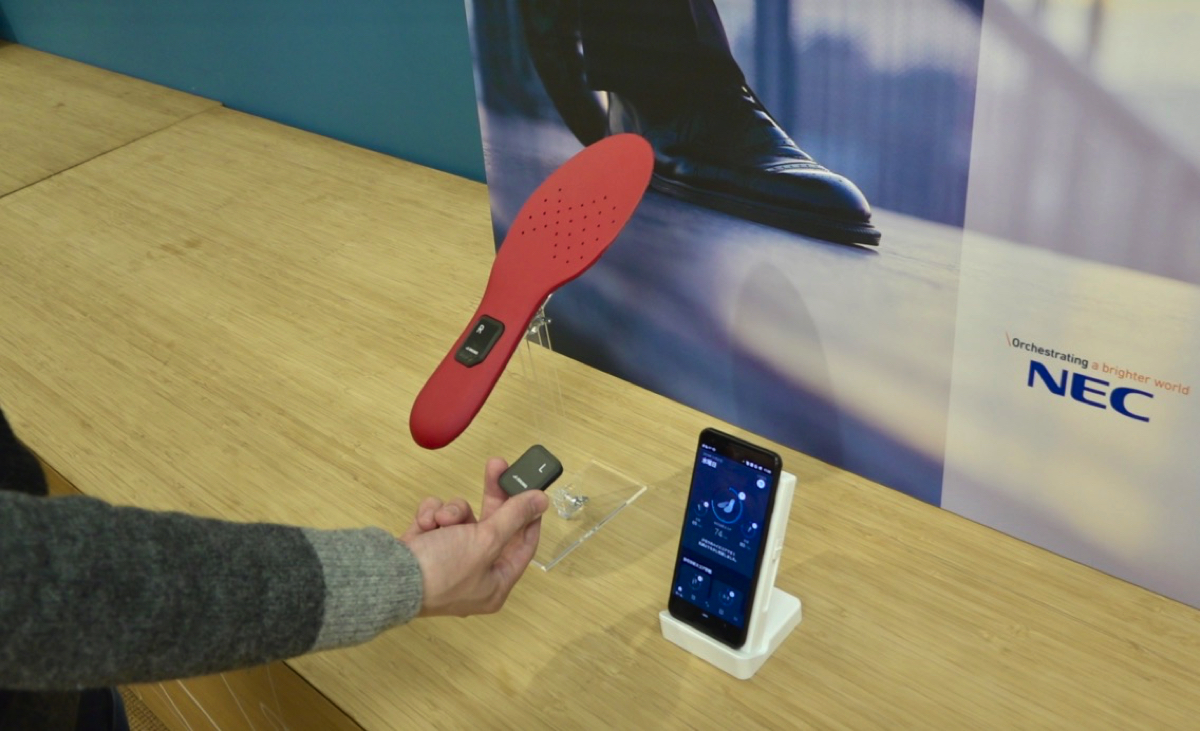 発表会当日は体験コーナーが設けられており、実際に履いてみました。フロアをぐるっと歩くと、足の裏にセンサーが入っているとは、言われないとわからないレベル。土踏まずあたりに位置しているのもありますが、「ありのままを計測するため、デバイスを意識させない」というNECのこだわりが感じられる仕上がり。