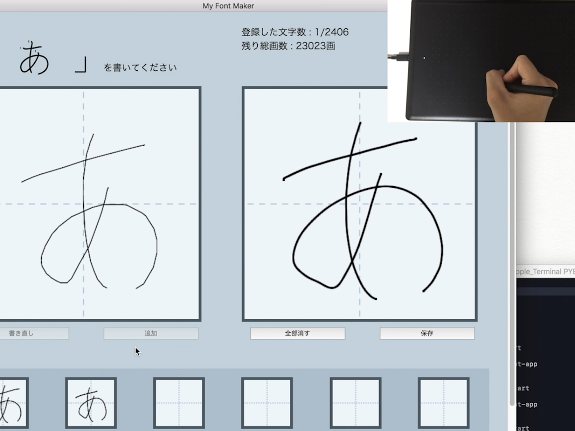 1文字3回程度書き、PCで"文字の平均化"を行うと手書きの質感を残しつつきれいな字ができあがっていく。7,000文字は書いたそう。