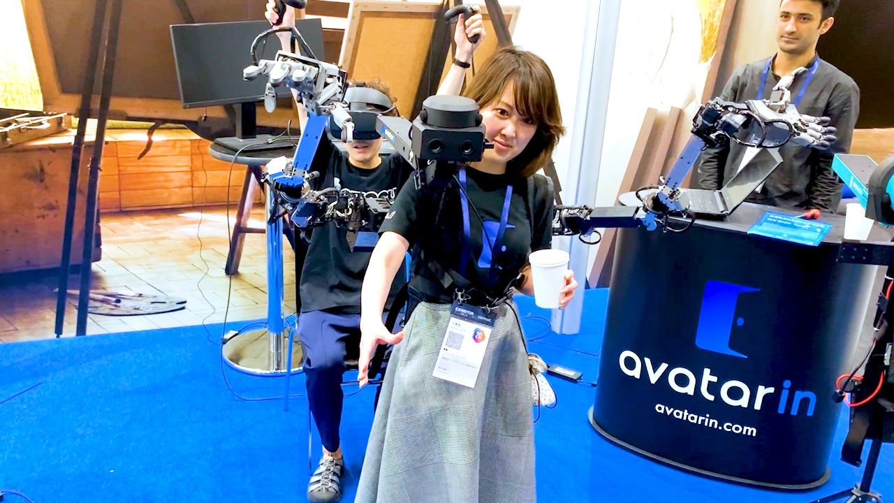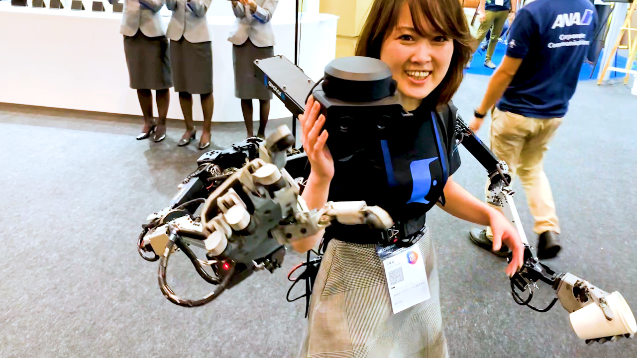背中からロボットアームを生やした女性を発見。これはVRヘッドセットとコントローラーで遠隔操作できるウェアラブルアバターとのこと。