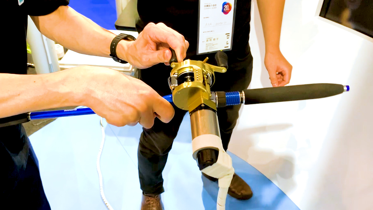 釣り竿がついたアバターロボットは、2台1組となっていて、1台は東京の会場に、もう1台は大分県の釣り堀に設置されていました。2台の動きはリアルタイムでシンクロしており、釣りを始めてみると、魚が食いついたあとはリールが重くなり、暴れる魚の衝撃がその手に伝わります。