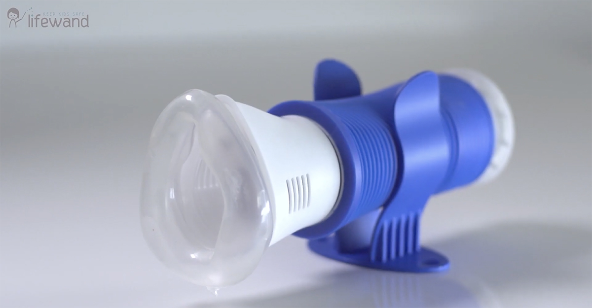 「lifewand」の原理は非常にシンプル。子どもの鼻と口を覆うように先端のパッドを当て、反対側を押せば筒がバネの力で引かれ、喉に詰まったモノを簡単に吸い出してくれる。