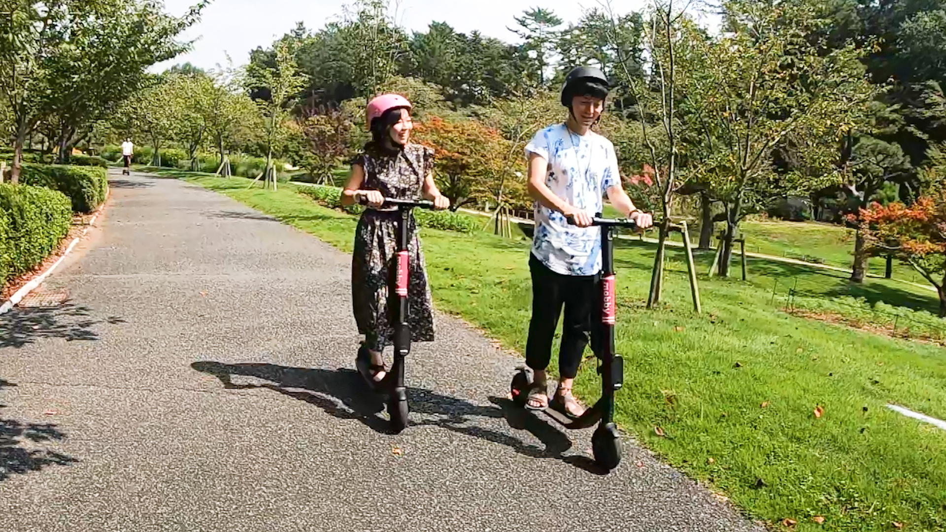静岡県浜松市のテーマパーク内の一角で、電動キックボードシェアサービス「mobby」の体験試乗会が開催された。