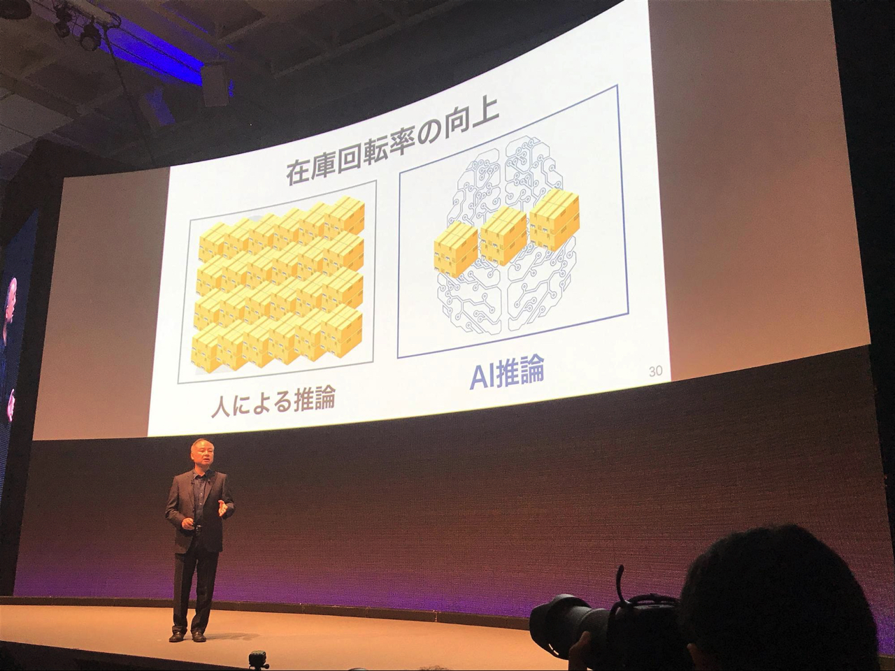 「もう実験室の中での実験は終わりました。それらの武器を、ビジネスに使うときです。SoftBankはその分野の世界一、最低でもその地域の1番ばかりに投資しています。働く人の90%が農業をやっていた時代は、2000年続きました。それが機械化されて、それ以外の仕事が生まれ、人間が進化していきました。AIに全てをやらせようというのは間違いです。人間もそうであるように、AIも適材適所なのです」(孫氏)。