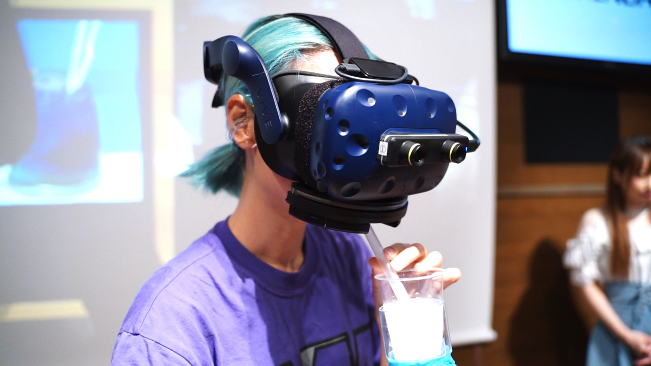体験会場で用意されていたのは、HTC VIVE Proに、VAQSO VRと、VRヘッドセットをAR化できる深度カメラ「ZED Mini」を装着したもの。そして、独自に開発したという、五味(甘味、酸味、塩味、苦味、うま味)をベースに作ったフローズンドリンクがありました。