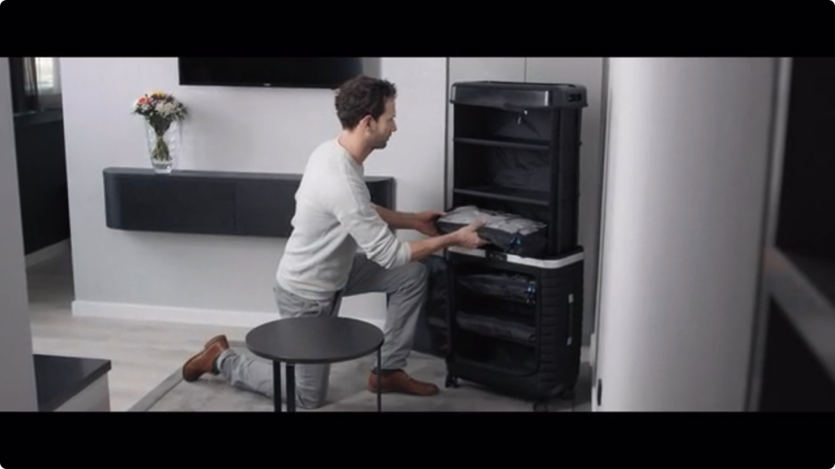「Pull Up Suitcase」はキレイに整頓出来なければ、かなり使いづらいスーツケースだ。本体上部のボタンを押して引き上げると、収納がサッと出現。一段ずつにボックスが用意されており、その中に衣類や小物をキレイに収納する。全て入れて押し戻せば、蛇腹のように美しく収まる。